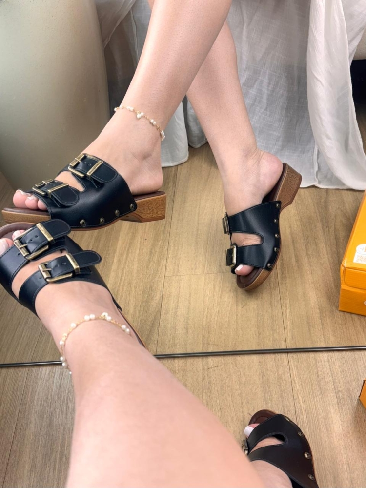 Tamanco com salto amadeirado e tiras em sintético com fivelas douradas. Estilo moderno e confortável para o dia a dia.