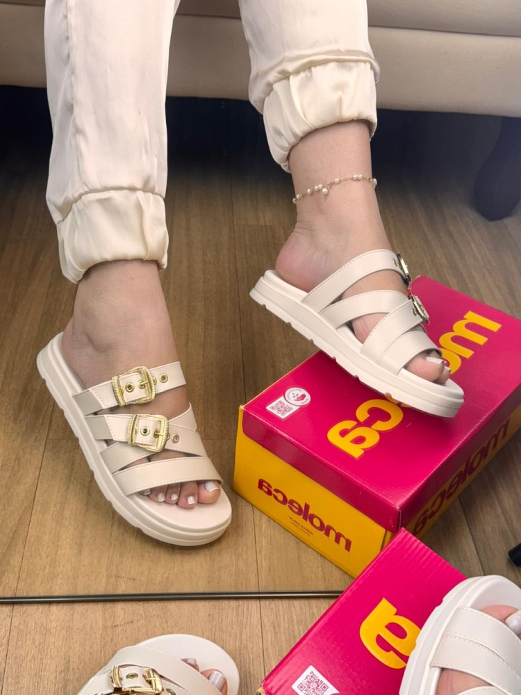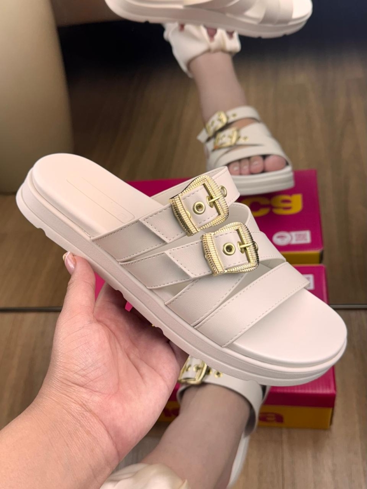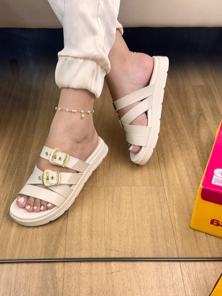 Flat Fashion Gold com fivelas douradas que trazem um toque moderno e sofisticado para qualquer look.