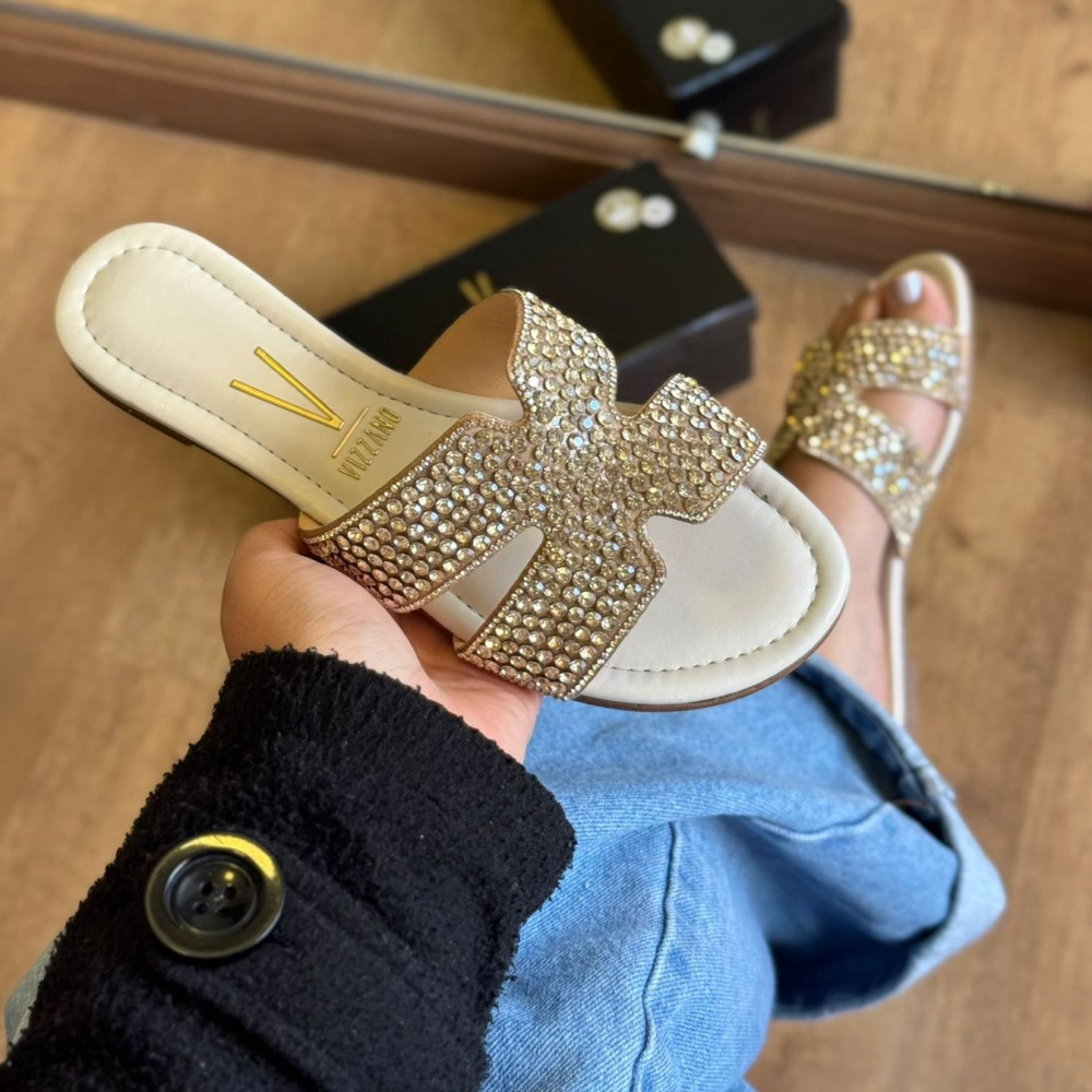 Um toque de luxo a cada passo, a Rasteira Glam Diamond vem toda cravejada em pedrarias, combinando conforto e brilho na medida certa. Perfeita para elevar o look do dia a dia ou arrasar á noite.