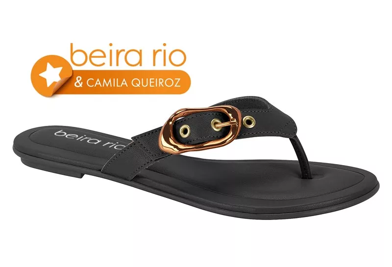 Uma rasteira com tiras delicadas e aplicações em Fivela douradas. Um modelo versátil e cheio de estilo.
